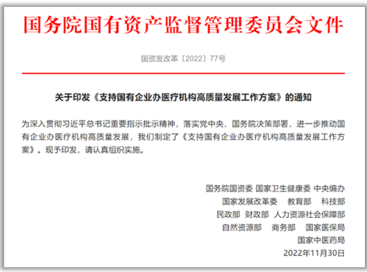 近日,国务院国有资产监督管理委员会、国家卫生健康委员会、中央机构编制委员会办公室、国家发展和改革委员会等13个国家部委办局联合印发《支持国有企业办医疗机构高质量发展工作方案》(以下简称《工作方案》)。